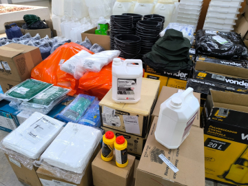 baldes, escovas, caixas multiuso, caixas frigoríficas, bandejas, lavadoras de alta pressão, mangueiras, pulverizadores, reservatórios, bombonas, mesas, cadeiras, luminárias de emergência, garrafas térmicas e tendas.